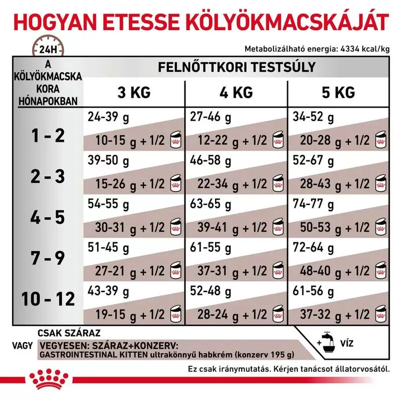 A fejlődésben lévő kölyökmacskák energia- és tápanyagigénye magas, ezért fontos a gyors segítség, ha emésztési panaszaik vannak. A Royal Canin Veterinary Feline Gastrointestinal Kitten eledelt speciálisan arra fejlesztették ki, hogy ellássa azokat a kicsiket minden fontos tápanyaggal, akik a bél akut felszívási zavaraival küzdenek. Egy olyan energia- és tápanyagdús diétás száraztápról van szó, ami kiválóan alkalmas betegség vagy műtét utáni lábadozáshoz is.